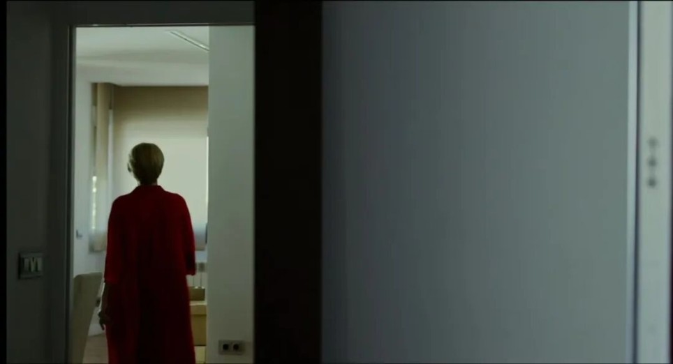 事实上胡丽叶塔的开场甚至将人拒之门外,她快速地行动,每一个镜头都只能停留在她简短的动作上:将书籍放在箱子里、打开门禁、在镜子里匆忙进入景深,有谁能注意到她吗?她本身是如此显眼,目光首先是停留在了陌生的红布、苍老的手和全貌的轮廓中,仅仅一瞬间,就在我们想要注意到更多时,胡丽叶塔离开了。如果说《蓝丝绒》开场的丝绒是一块完全陌异的世界的幕布,关于记忆的痕迹只留在了这里,那开场的红布会为我们留下身处侧面的我们的微弱余光。用神秘代替陌异,这何尝不是现实的痴迷?